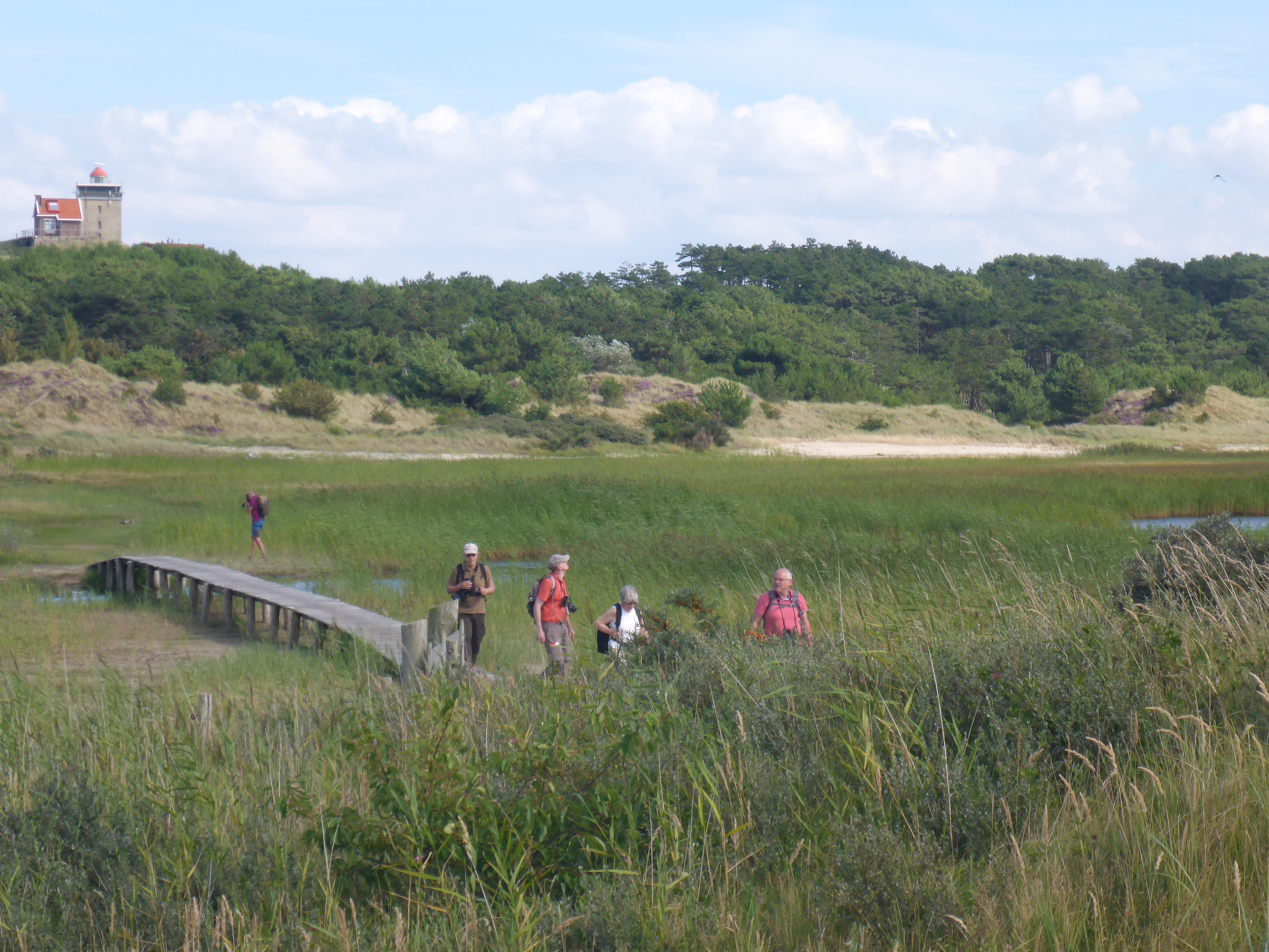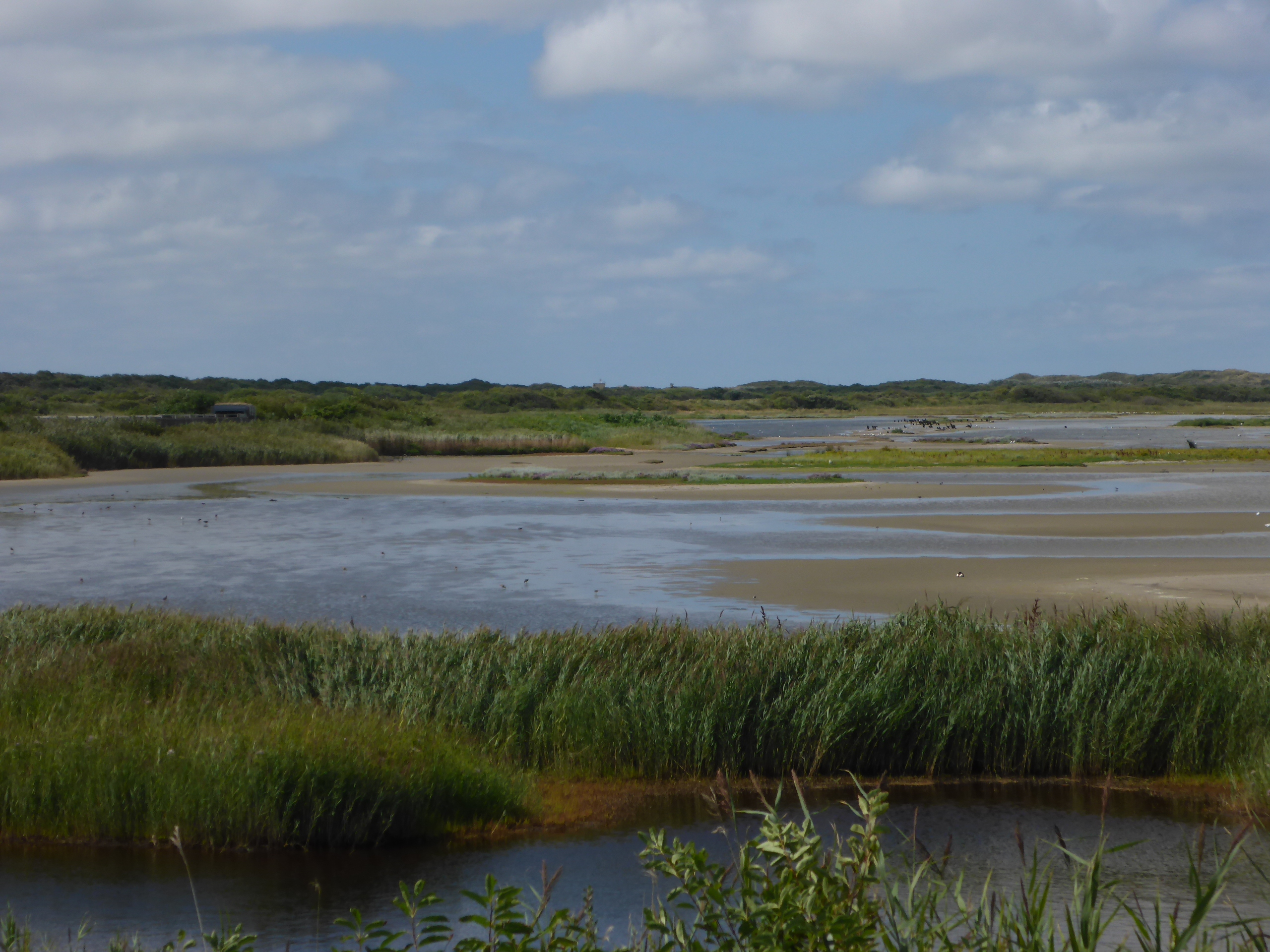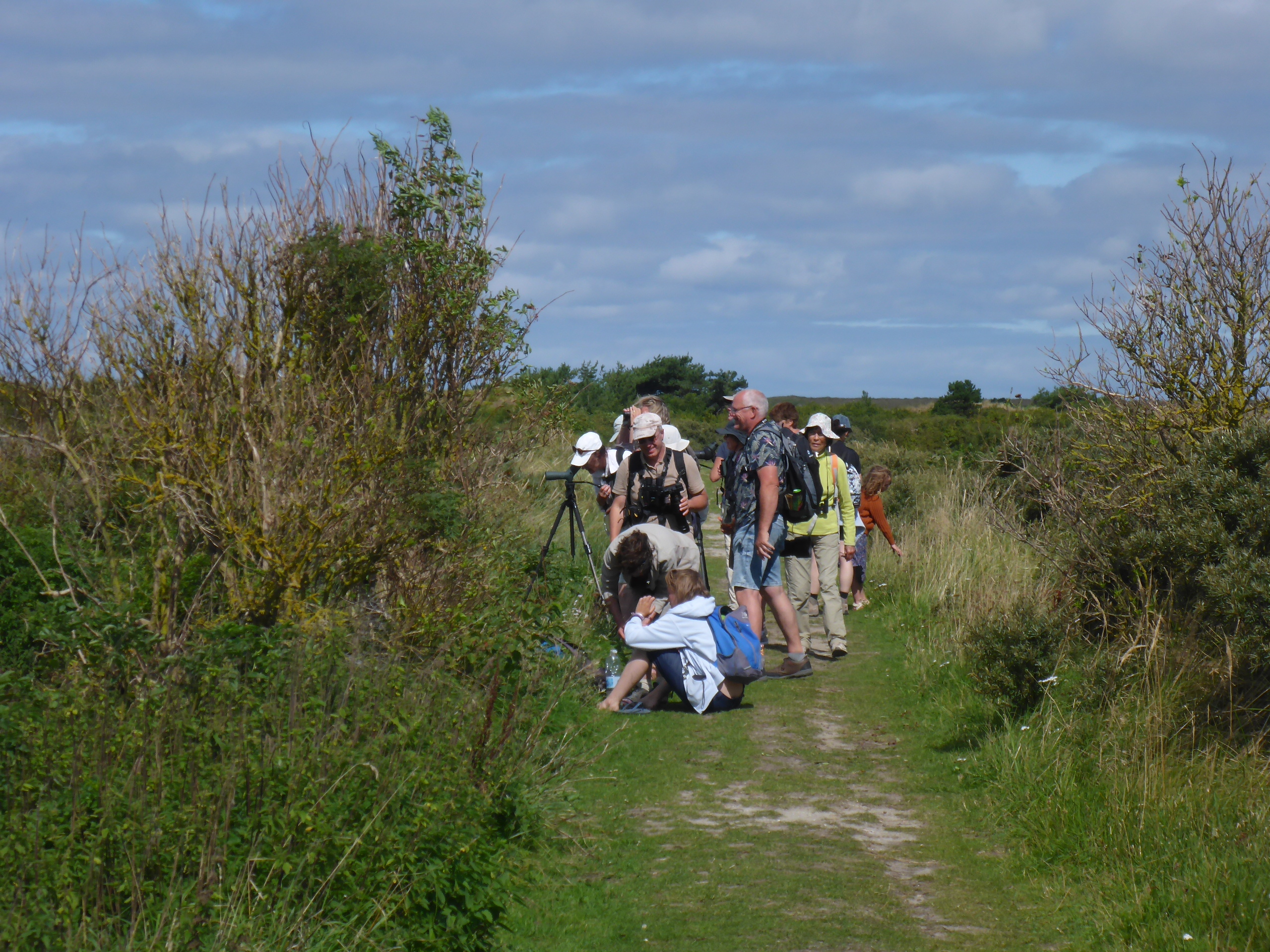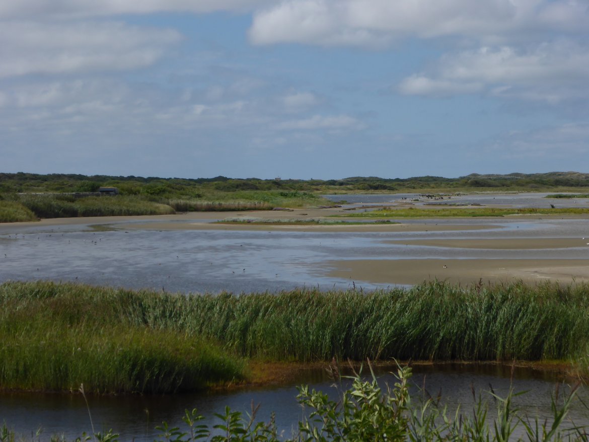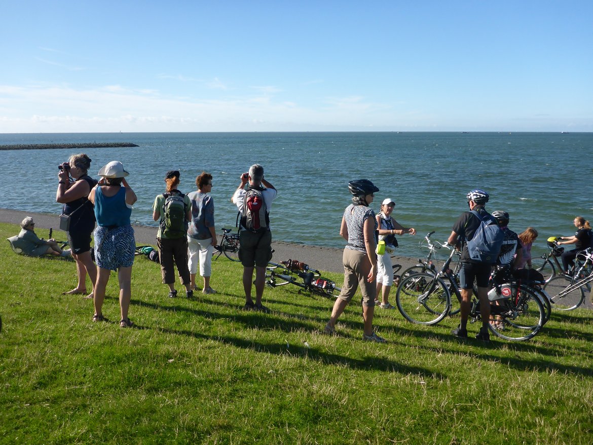 Arrivés au Kroonpolders, nous laissons les vélos pour longer la digue jusqu'aux dunes. La marée est encore haute et les oiseaux sont réfugiés dans les polders... Enormément de chevaliers gambettes, de cormorans, de spatules. On cherche les espèces plus rares qui se cachent parmi les autres : quelques bécasseaux cocorlis, un chevalier combattant et un chevalier sylvain, quelques chevaliers aboyeurs. Arrêt obligatoire au Posthuys pour un café, une bière, une tarte aux pommes ou une glace suivant les envies. Retour par les dunes ou par la route en fonction de l'état de chacun.