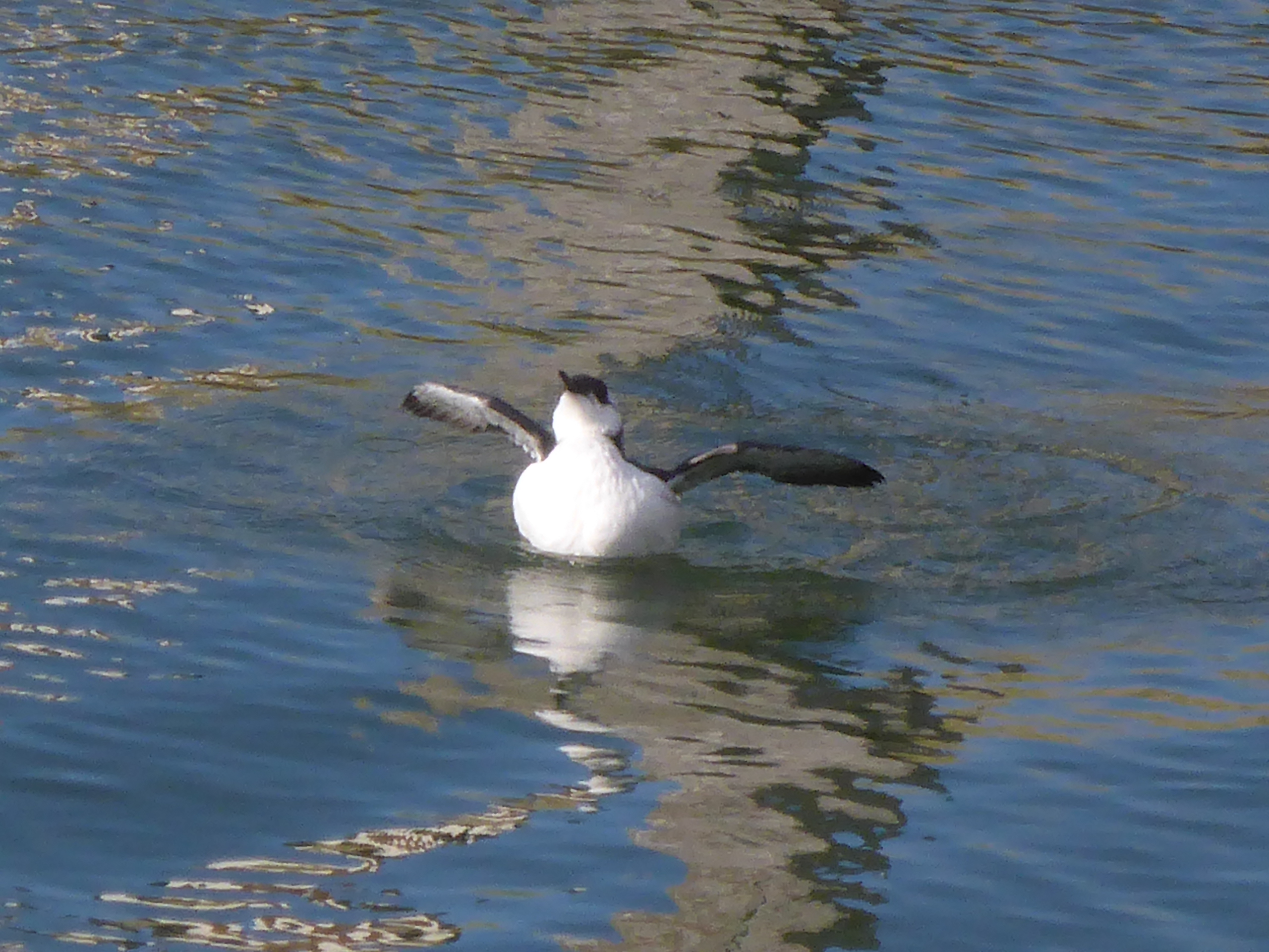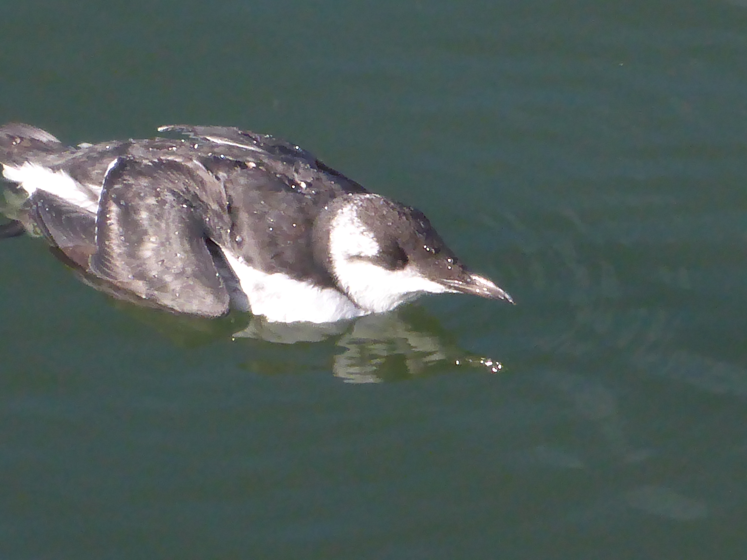 Première surprise de la journée : découverte dans le chenal d'entrée au port d'un guillemot de Troïl. Il est à moins de 10 mètres de nous, plonge régulièrement. Il s'agit d'un juvénile de l'année.. Fatigué, il a probablement chercher un endroit plus calme où pêcher.... survivra-t-il ?