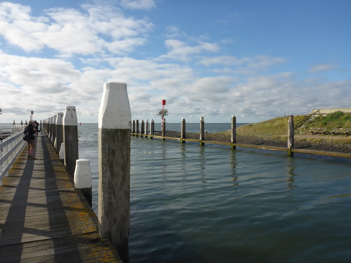 Départ pour Vlieland ou Terschellling ? Ce sera finalement Terschelling, le port est déjà plein sur Vlieland. La marée est haute, la barre est submergée, quelques cormorans et goélands sont sur les piquets. Vol de limicoles et quelques phoques sur le trajet et puis surprise, un pingouin torda... Ce n'est pas le dernier alcidé que nous verrons - un voyage un peu exceptionnel de ce côté là...