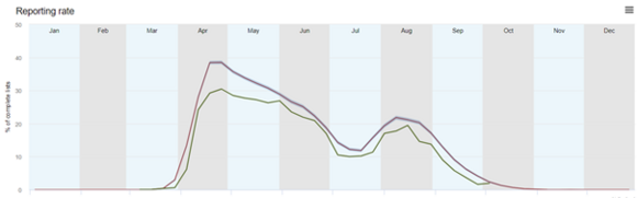 Exemple de ce que pourrait donner le suivi permanent de l’avifaune: ceci est un graphe montrant la fréquence du Pouillot fitis dans les listes complètes en Grande-Bretagne. En rouge/violet: la courbe historique. En vert: la situation en cours en 2020. Le Pouillot fitis est nettement moins présent en 2020. Source:  BirdTrack, British Trust for Ornithology